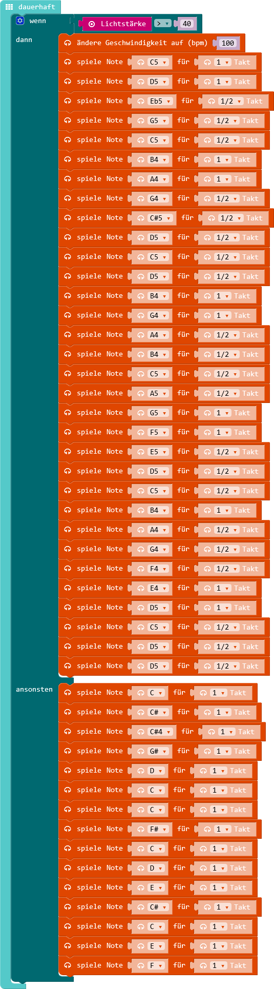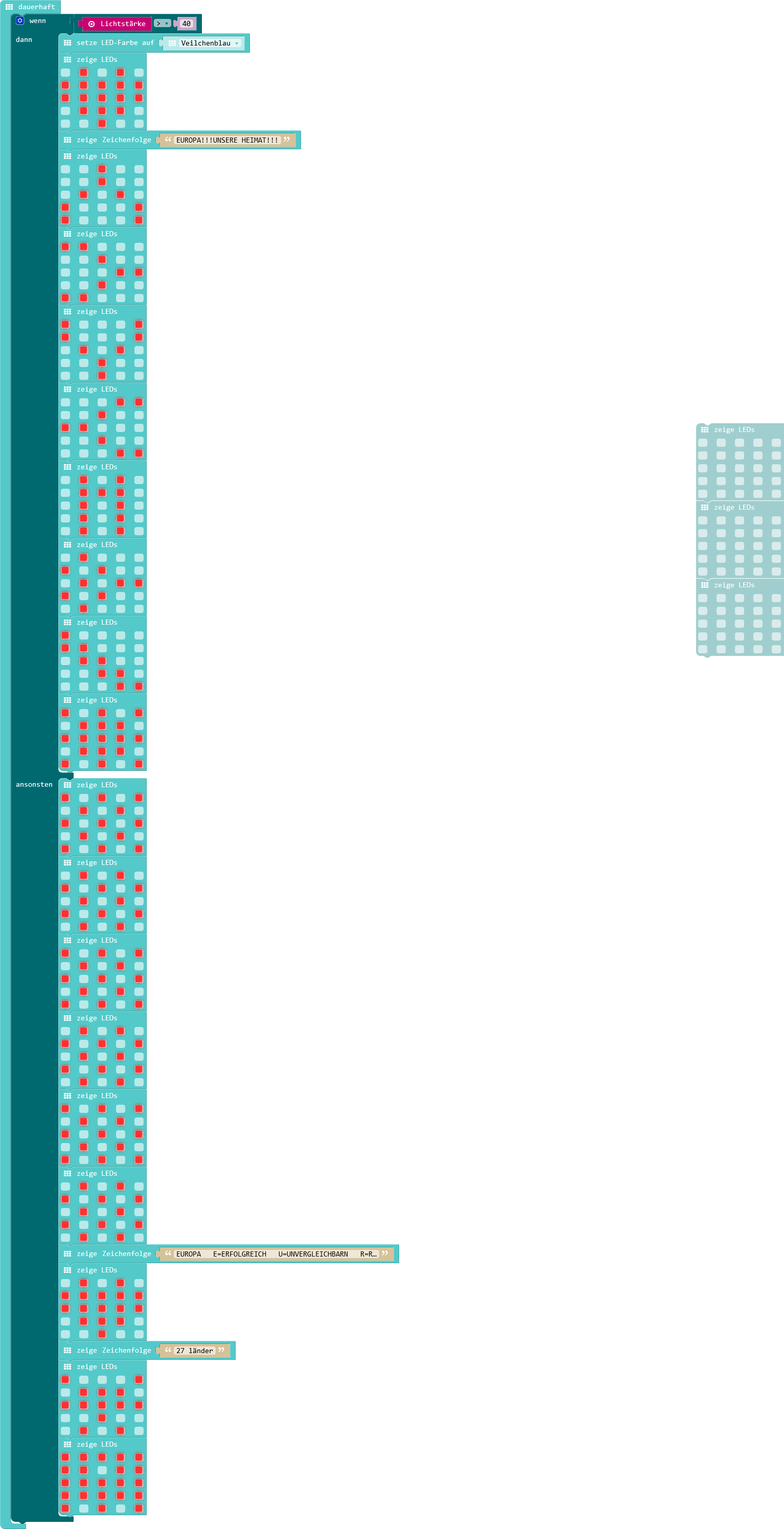 Die Codes Code 1: Die Europa-Sounds So haben wir die Europa-Sounds in Abhängigkeit mit der Helligkeit (Tag/ Nacht) programmiert. Code 2: Die LEDs Teilen mit: Klicke, um auf X zu teilen (Wird in neuem Fenster geöffnet) X Klick, um auf Facebook zu teilen (Wird in neuem Fenster geöffnet) Facebook Gefällt mir Wird geladen …